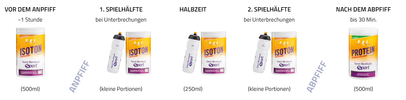Achte auf die optimale Versorgung vor, während und nach dem Spiel. Mit dem perfekten Produktmix aus Isoton-Energiedrink und Protein-Regenerationsturbo bist du am Spieltag optimal versorgt!
